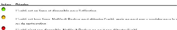 Dans la Gérer les périphériques page, vous pouvez afficher la liste des unités de stockage ajoutées au serveur NetVault Backup. Le statut de l’unité est indiqué par les icônes ci-dessous.