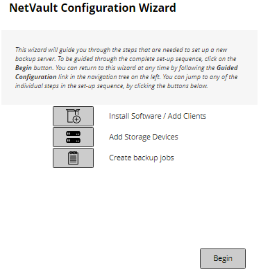 The NetVault WebUI provides a configuration wizard that guides you through the various aspects of setting up your backup system. You can use the wizard to install client and plug-in packages, add clients, configure devices, and create backup jobs. The configuration wizard can be accessed from the Guided Configuration link in the Navigation pane.