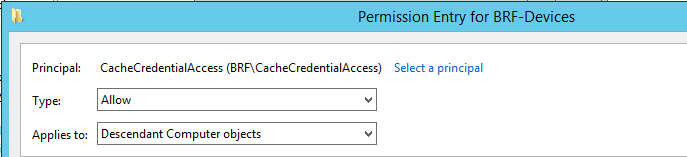7. Click Select a Principal and find the domain local group you created previously, ensure the type is set to Allow and the Applies to is set to Descendant Computer Objects.  Once the permissions have loaded you want to find and check off the permission Allowed to authenticate. You may have to screen down the list of available permissions to find it. Click Ok, once completed.
