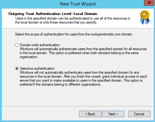 9. On the Outgoing Trust Authentication Level page, choose Selective authentication, click Next.