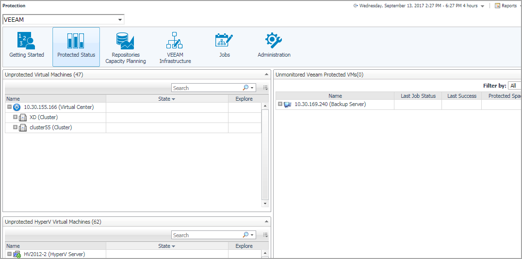 The Protected Status view of the Protection dashboard shows the unprotected virtual machines and unmonitored Veeam Protected virtual machines on the monitored Veeam Backup Servers. The Protected Status view includes the following two tables: