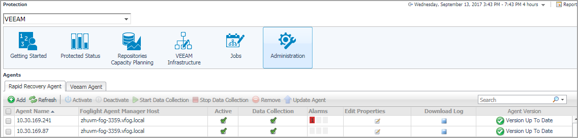 The Administration view of the Protection dashboard contains links to agent administration tasks that you can use to manage Rapid Recovery or Veeam agents.Foglight-FVE-FSM-vApp-standard