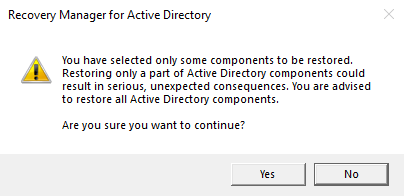 If you have only selected some components from the backup, you will get a waring message stating that your selection could result in serious unexpected consequences. If you are sure you want to continue then select Yes otherwise select No.