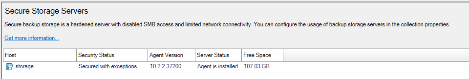 If an exception has been applied to a Secure Storage server the Security Status will read Secured with exceptions as seen below.