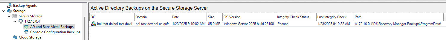 1. Active Directory and Bare Metal backups are displayed with information about the backup on the server including name of the domain controller, the domain, the date of the backup, the size of the backup, the OS version of the system backed up, status of any integrity check done on the backup, and the path of the location of the backup.