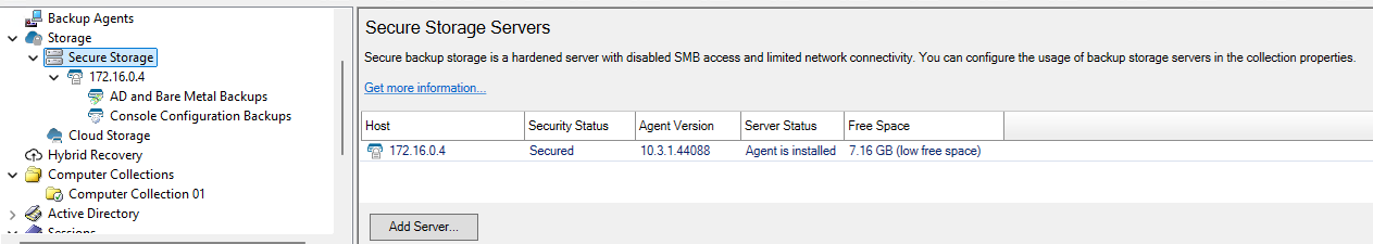 After a Secure Storage server (a standalone server) has been added, backups can be copied to the Secure Storage server. To enable and configure backups on the Secure Storage server you must enable backups for each Computer Collection separately. For more information on configuring backups on a Secure Storage server refer to Secure Storage server backups.