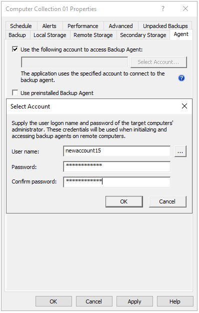 3. On the Agent Settings tab, select the option Use the following account to access Backup Agent and specify account credentials.