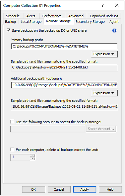 4. On the Remote Storage tab, select the option Save backups on the DC being backed up or a UNC share and enter the backup path. You need to specify path to the remote share in the following format (%DATETIME% variable is required ):