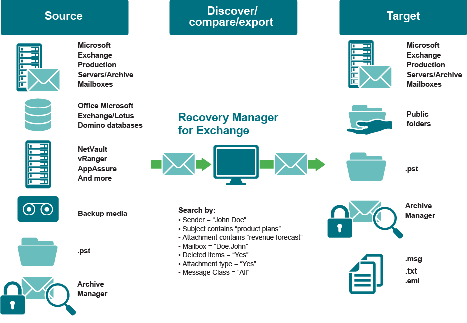 - Search and recovery for all Exchange content types. With its ability to search backed-up message and attachment content and recover selected public folders and public folder hierarchies, Recovery Manager for Exchange allows you to search and recover all Exchange backup data. Since a significant amount of corporate email data is found within attachments, being able to discover this data is crucial to any operational or compliance-driven recovery effort.