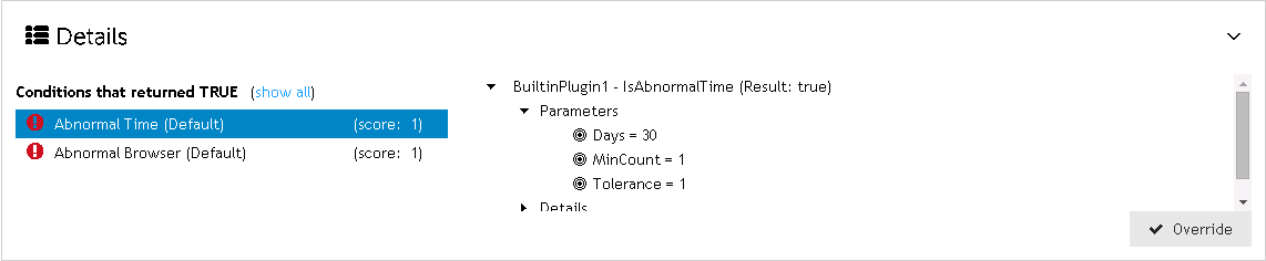 <plugin name> - <condition name> (Result: <true/false>) - This displays the name of the plugin, the name of the condition and whether the condition returned as true or false during the access attempt. For example, BuiltinPlugin1 - IsAbnormalTime (Result: true). |