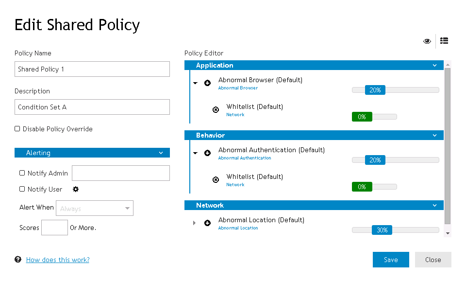 (Optional) To change the alerting configuration for the shared risk policy, click Alerting to expand the section and make any necessary changes.