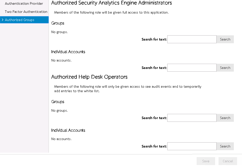This wizard allows you to manage Active Directory® or LDAP security settings for the Security Analytics Engine Administration web site. The wizard is also used for enabling and configuring two factor authentication using the Dell SMS service or a RADIUS server, and managing administrator and help desk roles.