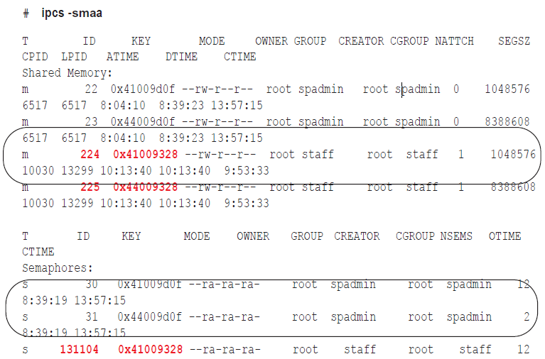 5. Verify that the shared memory IDs from the shmaddr.loc and shstinfo.ipc are in the list and that the keys match.