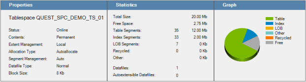 Note: For Oracle 11 (or later) databases, recycle bin space allocation information is included in the tablespace summary.