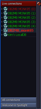 • This list shows the user-defined connection name for each database and for each database partition for which you created a connection profile and to which Spotlight is currently connected.