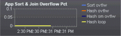 The App Sort & Join Overflow Percent graph relates the number of sort and hash join overflows to the total number of sorts and hash joins, respectively, generated by the application. These ratios, expressed as percentages, are determined for the application over consecutive monitoring intervals and are shown in the following series:
