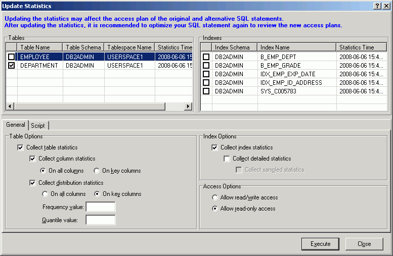 You can update the statistics for the tables and their indexes when you are viewing the Access Plan tab.