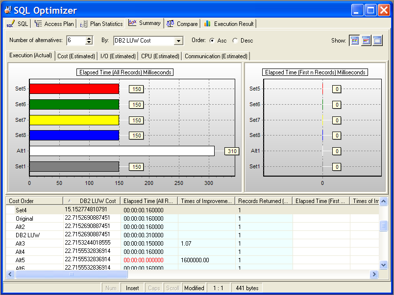 The Summary tab in the SQL Optimizer window displays the Run Time information and the cost estimates from various perspectives.