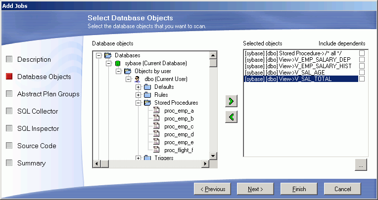 The SQL Scanner can scan all SQL statements within database objects. These include views, procedures, triggers, rules, defaults and tables. Use the Database Objects page on the Add Jobs wizard. The database objects can be selected by their object name, object type or user name.