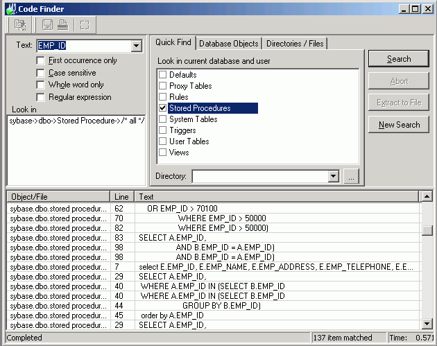 Specify whether to search for only the first occurrence of the text in the database object or file. If this option is not selected, all occurrences of the text displays.