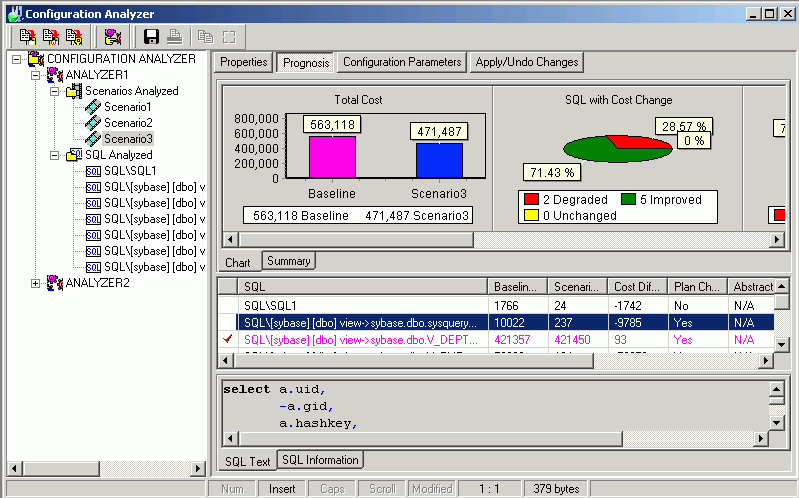 | SQL Analyzed | Displays the SQL statements selected from the SQL Repository for analysis and the query plans for each of the Scenarios. |