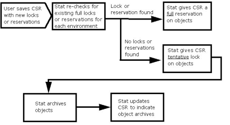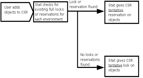 When you associate an object with a CSR, Stat automatically requests a lock for that object in the designated environments. Stat checks if there are existing locks or reservations on that object. If a lock or reservation exists, Stat issues a tentative reservation. If not, it issues a tentative lock. The lock or reservation remains tentative until you save the CSR.
