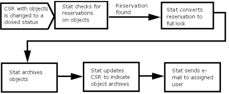 The third phase is the conversion of reservations into locks. Stat releases an object lock when the status of the CSR changes to a closed-type status, or when the developer manually unlocks the object or the object is reassigned to another developer. After unlocking an object, the Stat Central Agent then determines if there are any pending reservations on the object. If reservations on the object have been given to more than one user, these reservations are handled in chronological order, based on the time each lock was requested. The Stat Central Agent converts the first reservation in line into a lock and performs any applicable object archiving.