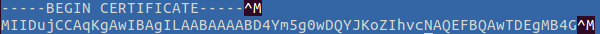 To verify this, open the certificate in a text editor, for example, MCEdit. Notice the^Mcharacters as shown in the image below: