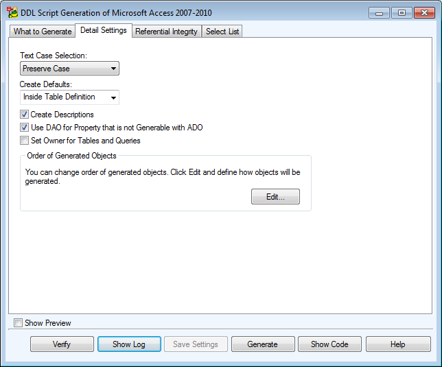 • Check Generate Captions in DDL Script Generation | Detail Settings for MS Access models