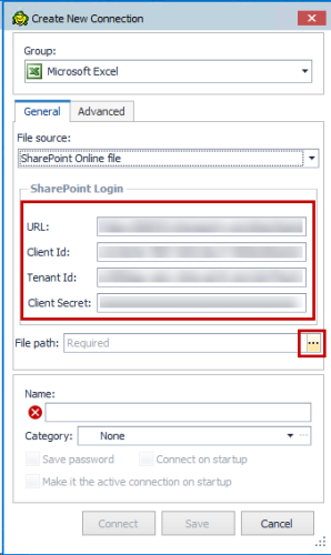 o Choose an existing file on the SharePoint Online Server (already specified through connection, or you can choose a different one) or
