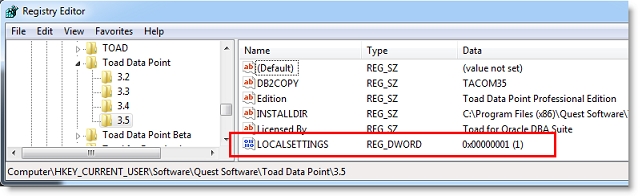 Caution: All current Toad settings will be lost after applying this Registry setting unless you manually copy the settings files from the default location (Roaming directory) to the new location (Local directory). Copy the settings files BEFORE you add the Registry setting and BEFORE opening Toad.