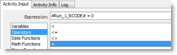 3. Complete the expression to read: #Run_1_RCODE# = 0. Notice that in the Variables list, each variable name is surrounded by hash (#) symbols. If you manually enter the variable name, you must surround the name with hash symbols.