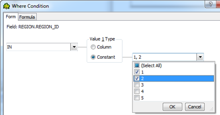 5. Select the Where field in the REGION_ID column and click . In the Where Condition editor, select the In comparison operator, select Constant, and select the values 1 and 2.