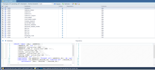 The Action center tab is the central point of the feature where all the current differences between the Database and repository are presented. It can be used to commit changes, view differences, filter objects, and change the current active branch.