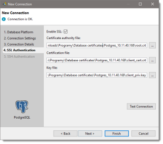 • In SSL Authentication click Enable SSL and enter paths or click browse to set your Certificate authority file, Certification file and Key file