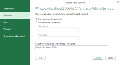 • In the next dialog, select Windows or Basic authentication, depending on what authentication method is used to connect to TIC