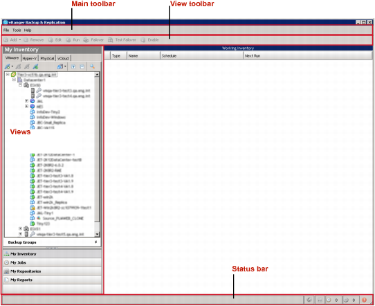 The vRanger UI consists of four views: My Inventory, My Repositories, My Jobs, and My Reports. Each view features the Main toolbar and each pane’s toolbar.