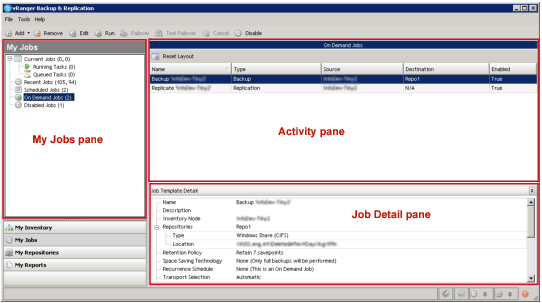 The Job Detail area contains job configuration data and the progress and status of currently running jobs and tasks. This area features two tabs: Detail and Log. For example, if you select Recent Jobs in the My Jobs pane, the Job Detail area displays this type of data in the Detail tab. The data in the corresponding Log tab indicates which VMs or servers were retrieved, which disks were skipped, and which tasks were completed. It also indicates that the job was saved.