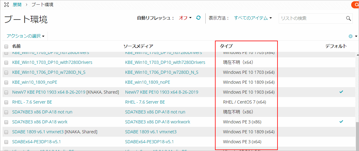 展開|ブート環境 一覧の タイプ列 あるいは 各ブート環境詳細の Windows PEバージョン の項目から確認できます。