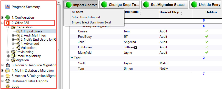 Migrator for Notes offers two options for importing user information from Excel. The most commonly used method is Import Select Users from Excel, which will import new users and mail-in databases (users and MIDBs that don’t already exist in the application) into the application.