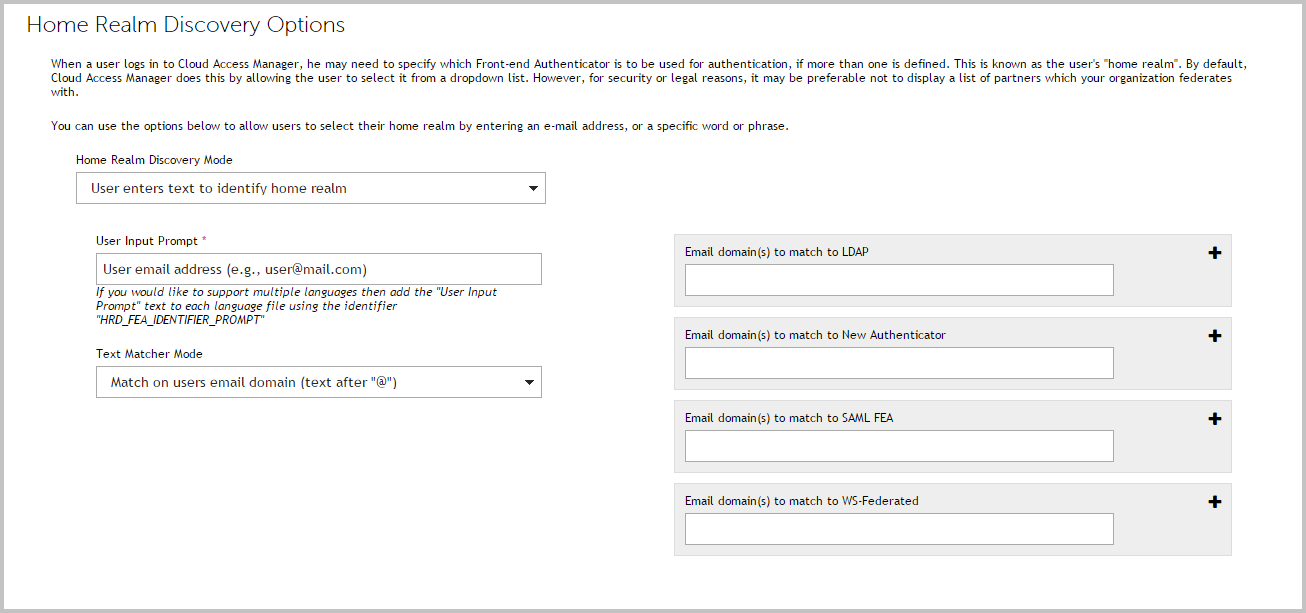 NOTE: The prompt in the text box is configured in the Home Realm Discovery settings page. The user must enter the text as prompted and click Log in. Authentication will then be directed to the selected front-end authenticator.
