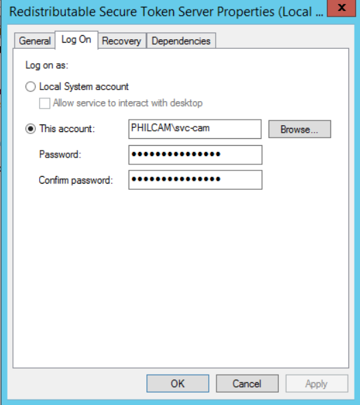 2. Right click on the Redistributable Secure Token Server service and select Properties.