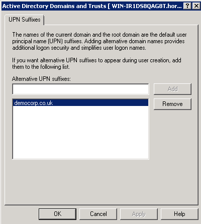 In Active Directory, add your Office 365 domain as a User Principal Name (UPN) suffix using Active Directory® Domains and Trusts. Right-click the top node, then select Properties to access the UPN suffixes dialog. |