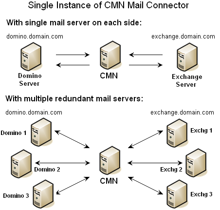 A single instance of CMN’s Mail Connector may connect through a single Notes server and a single Exchange server, or between multiple mail servers on either or both sides of the CMN service. Regardless of the number of servers or your preferred routing scheme, all mail servers on both sides must be defined in the CMN Mail Connector configuration file. Inbound and outbound servers may be specified to CMN by their DNS names, IP addresses, or MX record notations. For receipt of inbound messages (from the Internet), CMN distributes the traffic among multiple mail servers on either side in a round-robin array.