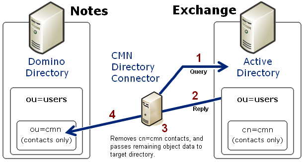 Finally (4), the Directory Connector passes the data to the reserved cn=cmn container within the target directory. If a target container by that name does not already exist in AD, CMN will create it, within a target container that you specify. That is, the cn=cmn container will be a subset of the specified target container ("ou=users" in the above illustration). When a connector is defined to run from Exchange to Notes, the process works the same way in reverse, although the target CMN container in Domino is designated ou=cmn rather than cn=cmn: