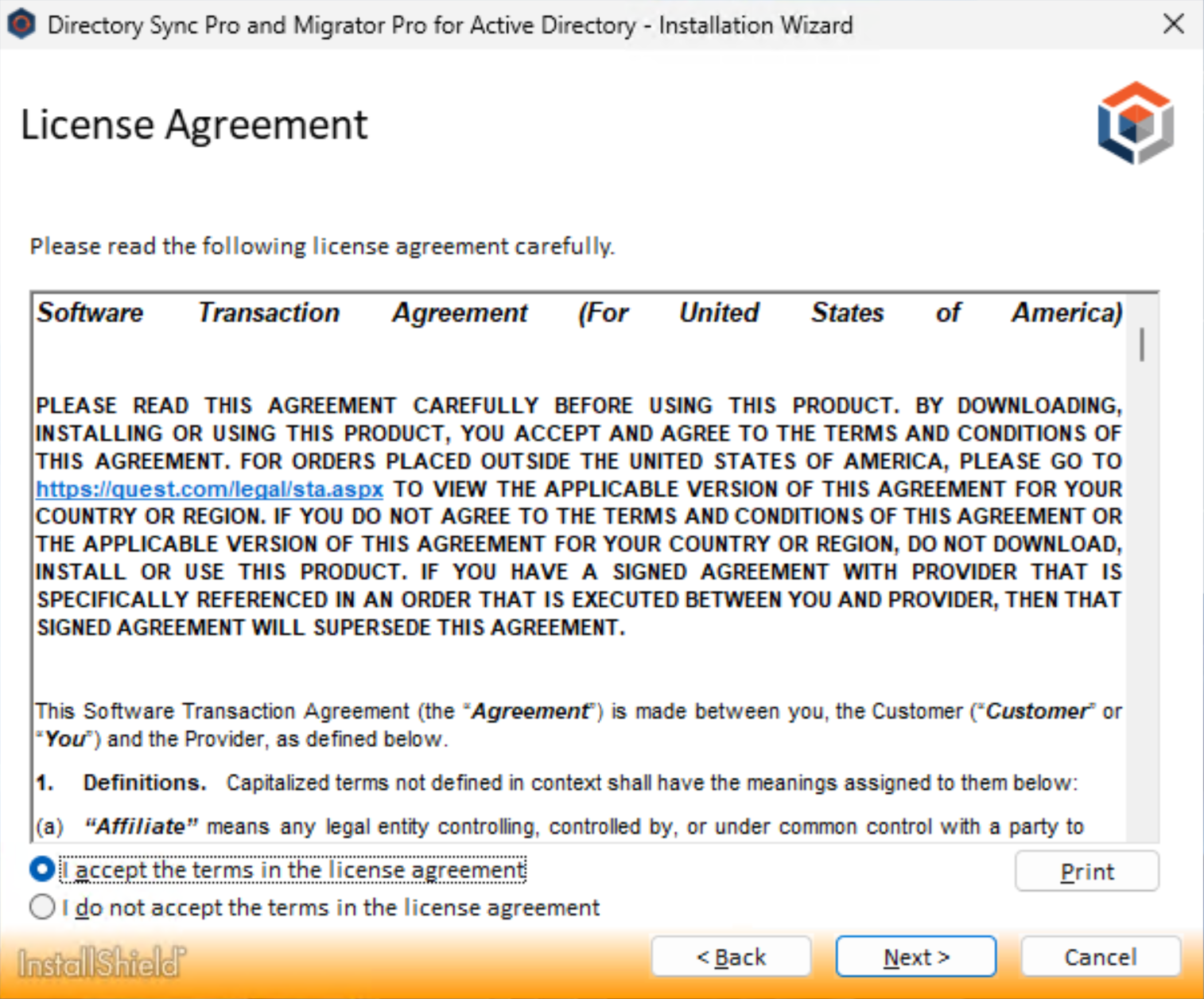 The License Agreement screen appears. To accept the terms of the license agreement and continue with the install, select “I accept the terms in the license agreement” and click Next.