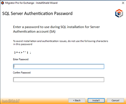 The SQL Server Authentication Password screen will appear during installation. Enter a password to use during SQL installation and click Install.