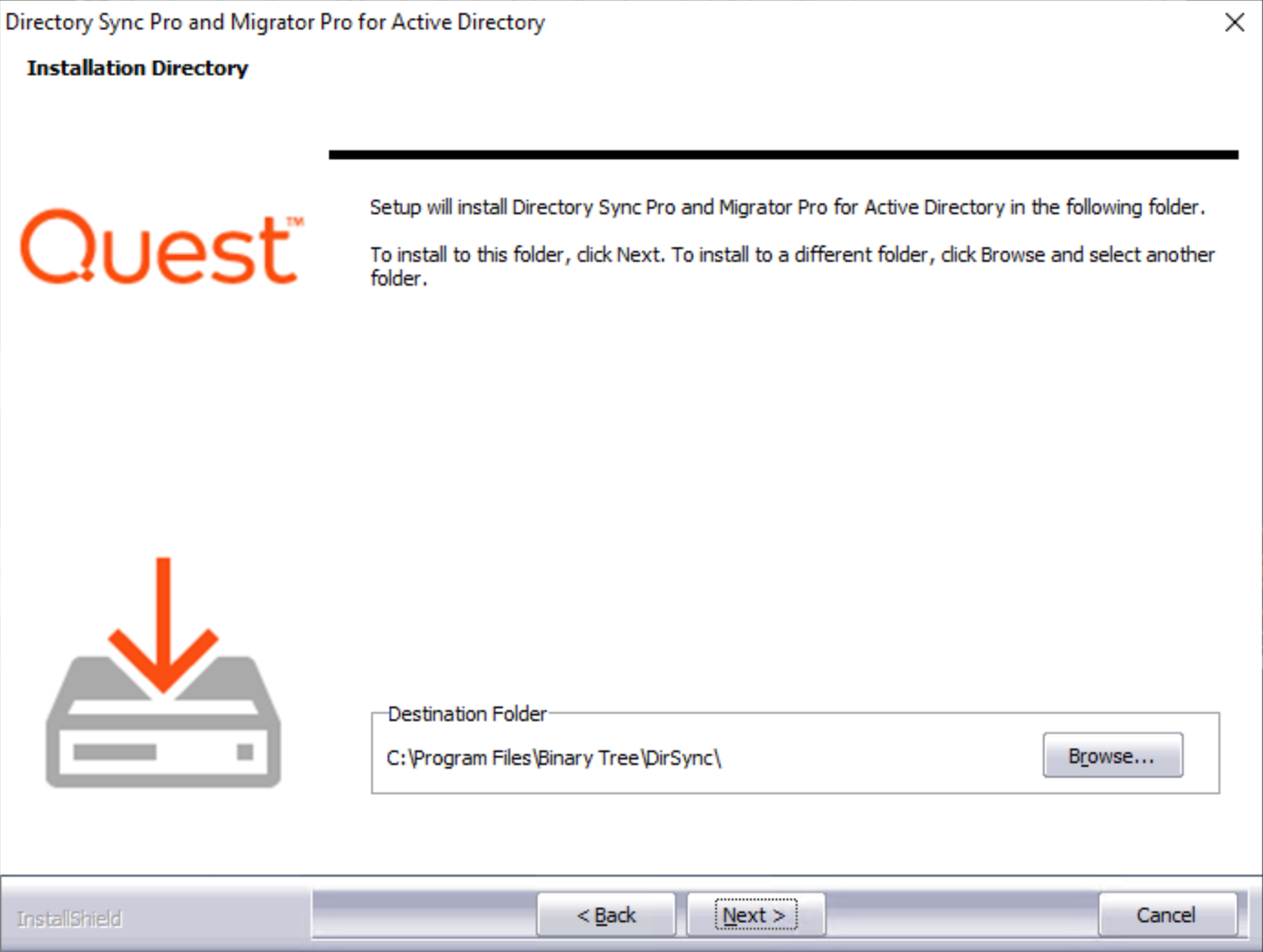 The Installation Directory screen appears. Both Directory Sync Pro for Active Directory and Migrator Pro for Active Directory are installed in the same directory. Click Browse to choose a different install location. Click Next to continue.