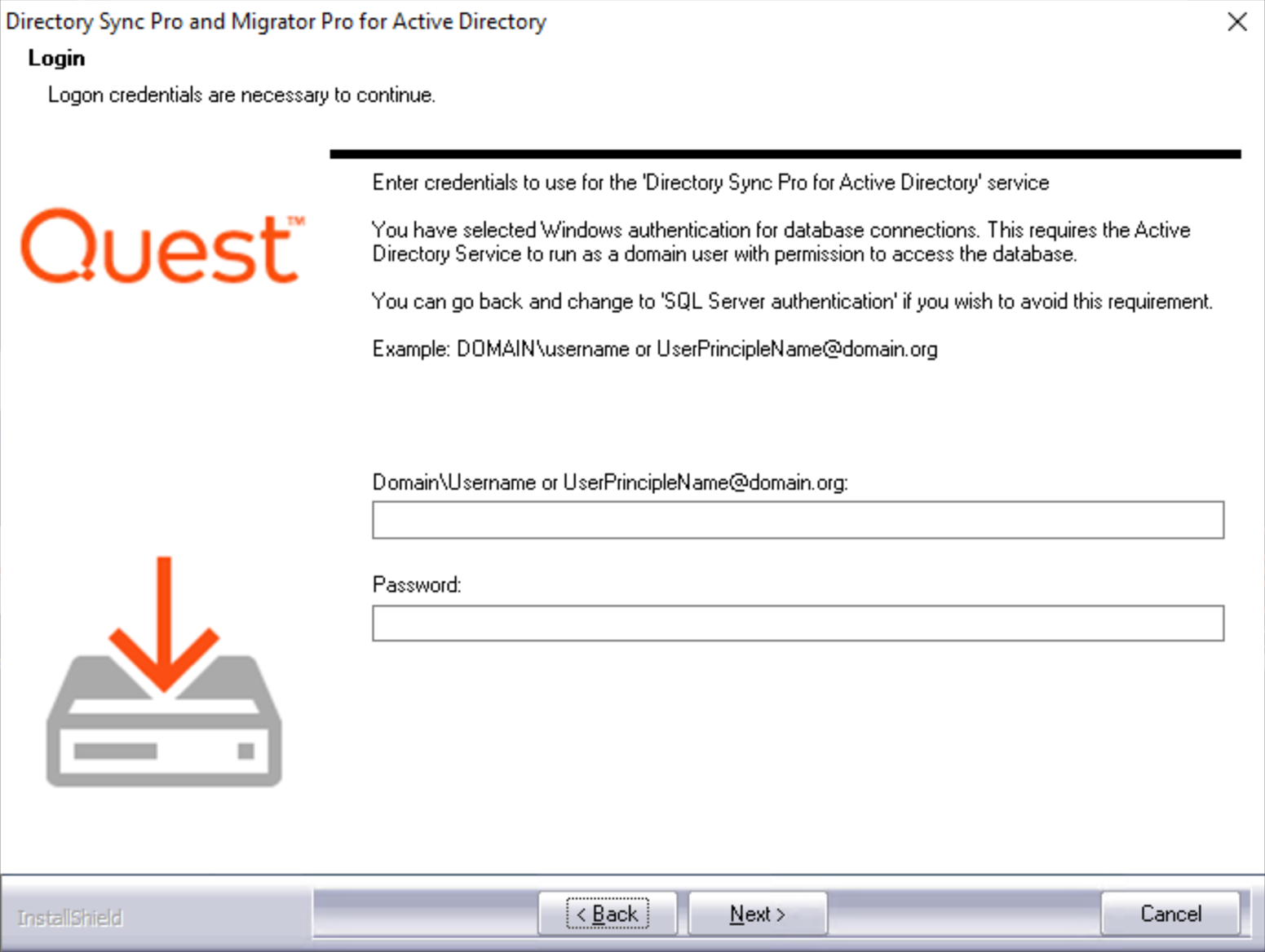 If you selected to connect using Windows Authentication on the previous screen, a screen to enter domain username and password appears. Enter the domain user in DOMAIN\username format and the password. Click Next to continue.