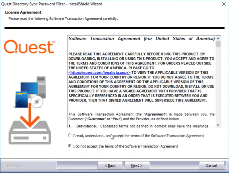 On the Domain Controller, click the QuestDirectorySyncPasswordFilter icon. The install wizard appears.